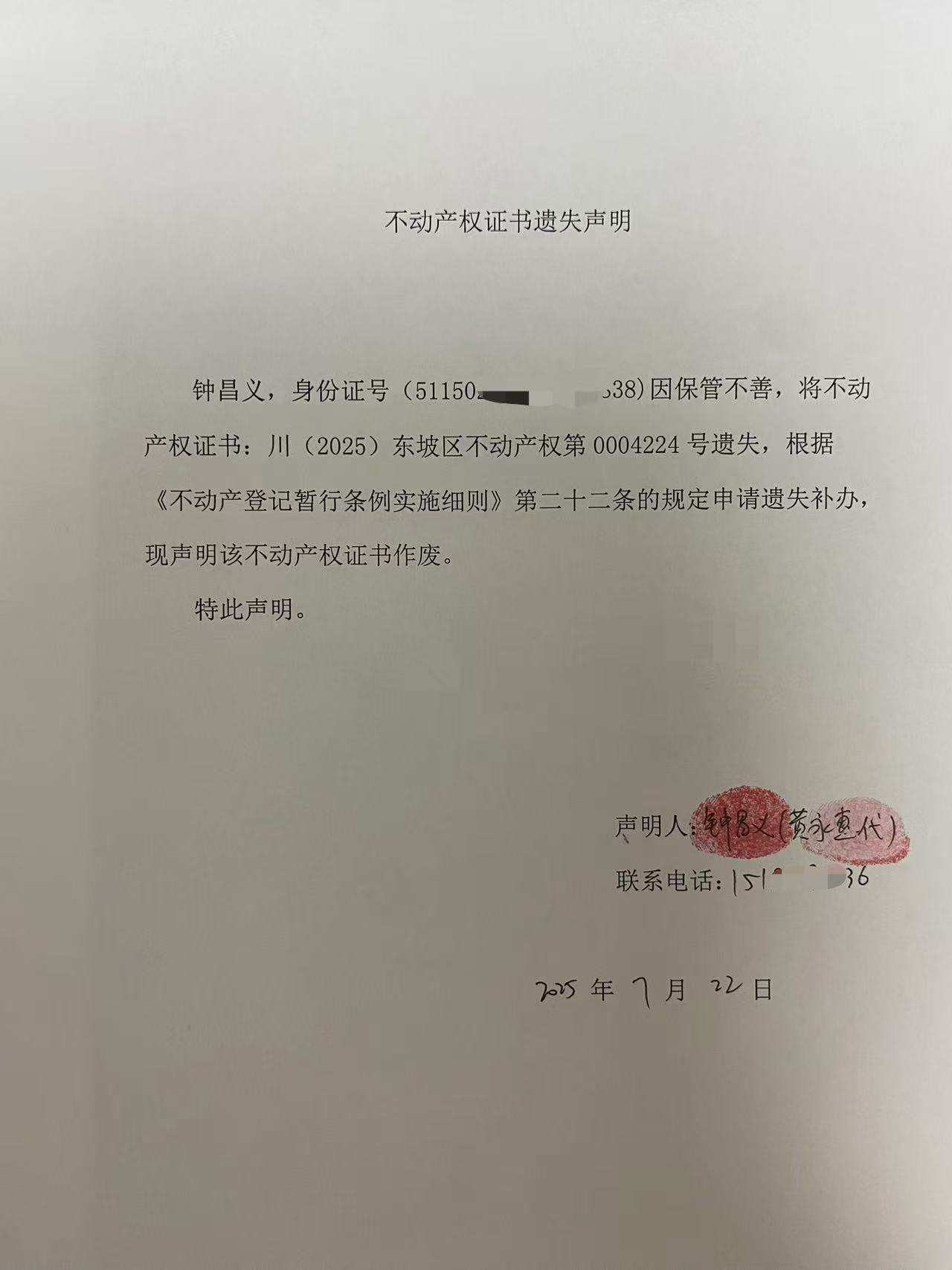 上一条:(伍勇)不动产权证书遗失声明 下一条:不动产首次登记公告(梁丽霞、刘桂容、李明林)